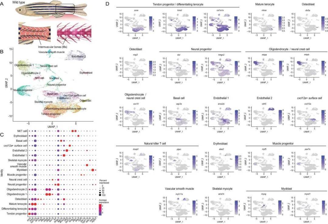 斑马鱼因其与人类基因十分相似,生物结构、生理功能与哺乳动物高度相似,且因其养殖成本低、发育周期短等优点,常常被用作模式动物来研究。在派森诺水产单细胞测序项目中,成功协助老师绘制了斑马鱼肌肉组织单细胞图谱,研究了斑马鱼的肌间刺(IBs)的发育机制和分子基础。