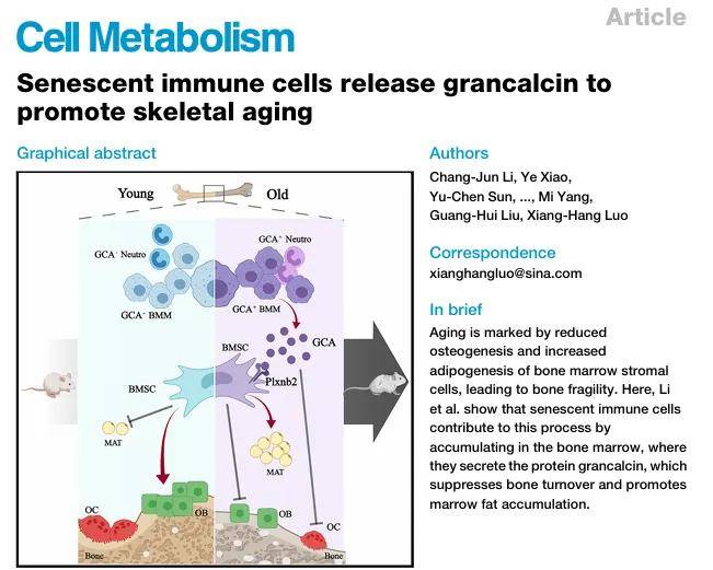 结论:本文研究发现,在大鼠和小鼠衰老时,骨髓中促炎和衰老亚型的巨噬细胞与中性粒细胞等免疫细胞会大量累积并分泌粒钙蛋白(GCA);GCA 与骨髓间充质基质细胞的 plexin - b2 受体结合,抑制下游信号通路,致使成骨受抑、脂肪生成增加,从而推动骨骼衰老进程 ;通过构建基因敲除小鼠模型和细胞实验,证实了 GCA 在骨骼衰老中的关键作用;开发的 GCA 中和抗体可改善老年小鼠骨骼健康,为治疗年龄相关骨质疏松症提供了潜在靶点,但研究存在无法排除其他因素影响、未探究其他受体及特定细胞过表达等局限,有待进一步研究。