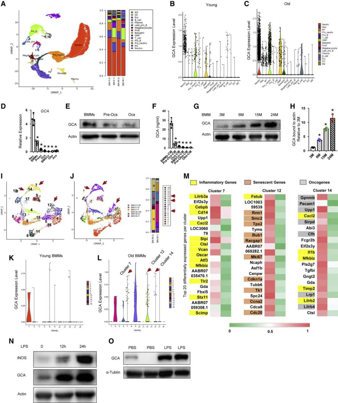 ⏩单细胞转录组揭示 GCA 主要在衰老免疫细胞中高表达且相关基因与炎症、衰老通路有关;