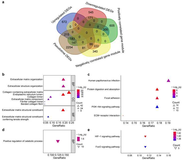 结论:本研究整合bulk转录组测序+单细胞转录组测序两种测序数据,发现 271 个共享基因,其 TFs 和 lncRNAs 表达模式与前人研究相符。拟时间模型中, bulk - seq 上调或下调基因在拟时间起点或终点上调,可能是 Osteoarthritis (OA) 进展的生物标志物。交集基因富集通路为 OA 治疗提供潜在靶点,如 HIF - 1 信号通路。转录调控网络中,PTTG1 及其下游基因可能促进炎症,抑制 PTTG1 或有益。此外,CYTOR 与 NRP1 的调控关系可能影响 OA 疼痛和疾病进展,但本研究存在样本年龄和性别差异等局限,需实验验证。