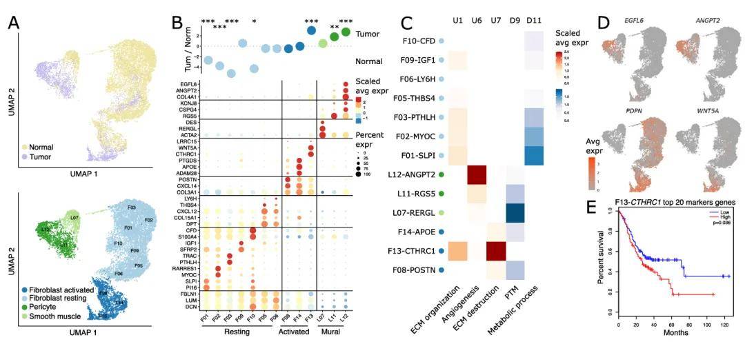 ⏩反卷积分析细胞亚型影响:以 scRNA-seq 数据为参照,用 CibersortX 对 TCGA 队列样本 bulk-seq 数据反卷积,分析细胞亚型占比,评估其对病人生存的影响,发现 F13-CTHRC1 等亚型比例高会缩短患者生存时间,cDC1 树突状细胞比例有积极作用,部分内皮和上皮细胞亚型有消极影响。
