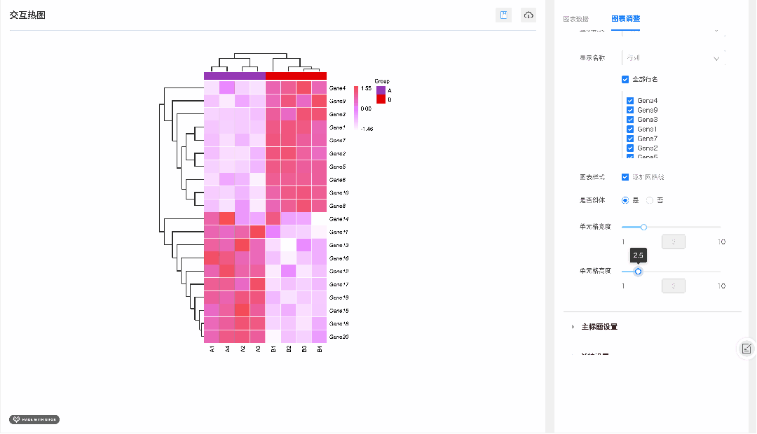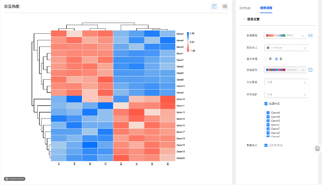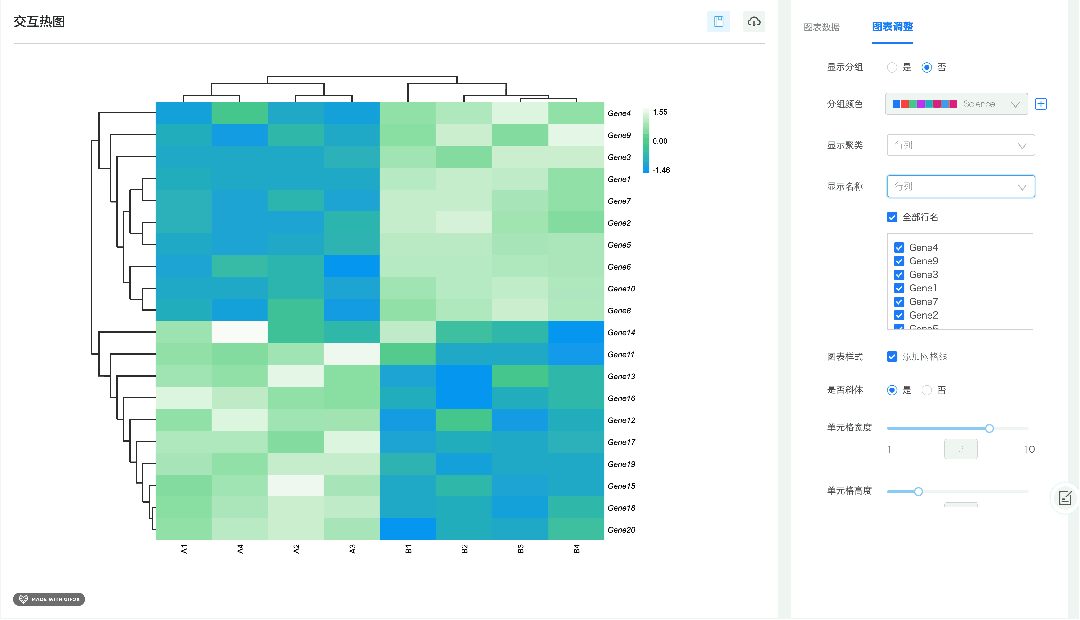 可根据需要来选择显示和隐藏基因 / 样品名称,当数据量大时,可以避免图表名称堆叠过于杂乱,轻松查看特定基因 / 样品的表达情况。