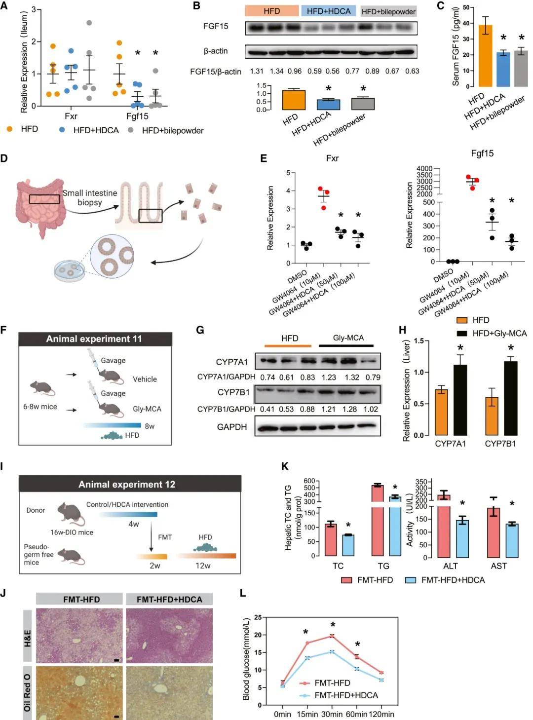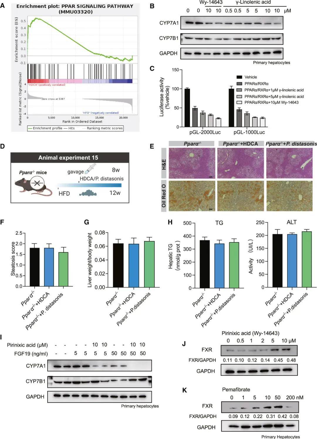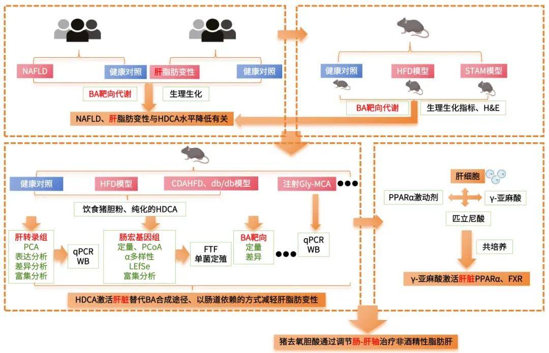 研究结论:本文研究了一组由肠道微生物群修饰的胆汁酸(BAs),即猪去氧胆酸(HDCA)species,与非酒精性脂肪肝病的存在和严重程度呈负相关。在多种小鼠模型中,HDCA被证实能够通过抑制肠道的法尼酯X受体(FXR)并上调肝脏的CYP7B1来缓解NAFLD。此外,HDCA显著增加了益生菌种类如狄氏副拟杆菌的丰度,这种益生菌通过脂肪酸-肝脏过氧化物酶体增殖物激活受体α(PPARα)信号通路增强脂质分解代谢,进而上调肝脏的FXR。这些发现表明,HDCA具有治疗NAFLD的潜力,其独特机制是同时激活肝脏的CYP7B1和PPARα。