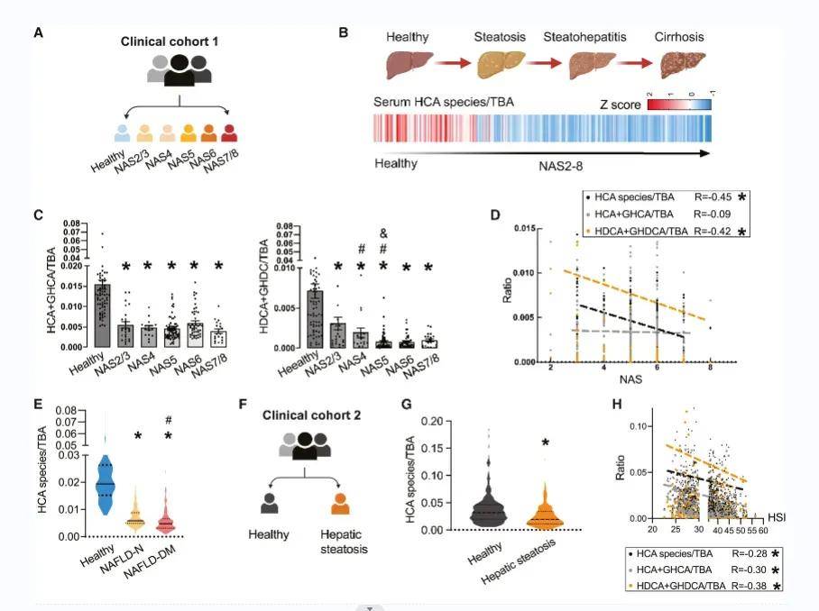 部分研究结果:BA作为一种信号分子,在NAFLD的发病机制中发挥着重要作用,已被越来越多的人所认识。本研究首次发现,在从脂肪变性到肝硬变的所有阶段,NAFLD患者的血清HDCA水平都显著降低,而在NAFLD和糖尿病患者以及动物模型中,HDCA水平的下降更为明显。值得注意的是,使用HDCA治疗后,小鼠的NAFLD表型和IR显著改善。肝脏经典的BA合成途径和替代的BA合成途径分别产生12OH和非12OH BA。在生理条件下,寄主在两条合成途径之间保持着微妙的动态平衡。在HDCA干预后,我们观察到非12OHbas的比例增加,12OHbas的比例降低。以前的研究已经报道了12OHbas升高与宿主糖和脂代谢紊乱之间的高度相关性。肝细胞色素P7B1是BA合成途径中的限速酶,与NAFLD和糖尿病的进展和治疗密切相关。研究者还提出,通过激活CYP7B1驱动的替代BA合成途径来恢复BA生物合成的动态平衡状态,有利于许多代谢性疾病,包括肥胖、糖尿病、高胆固醇血症和NAFLD。在本研究中,我们发现选择性地激活BA的替代合成途径可以显著降低肝甘油三酯。这些结果为经典途径和替代途径在调节肝脂代谢中可能发挥不同作用提供了证据。