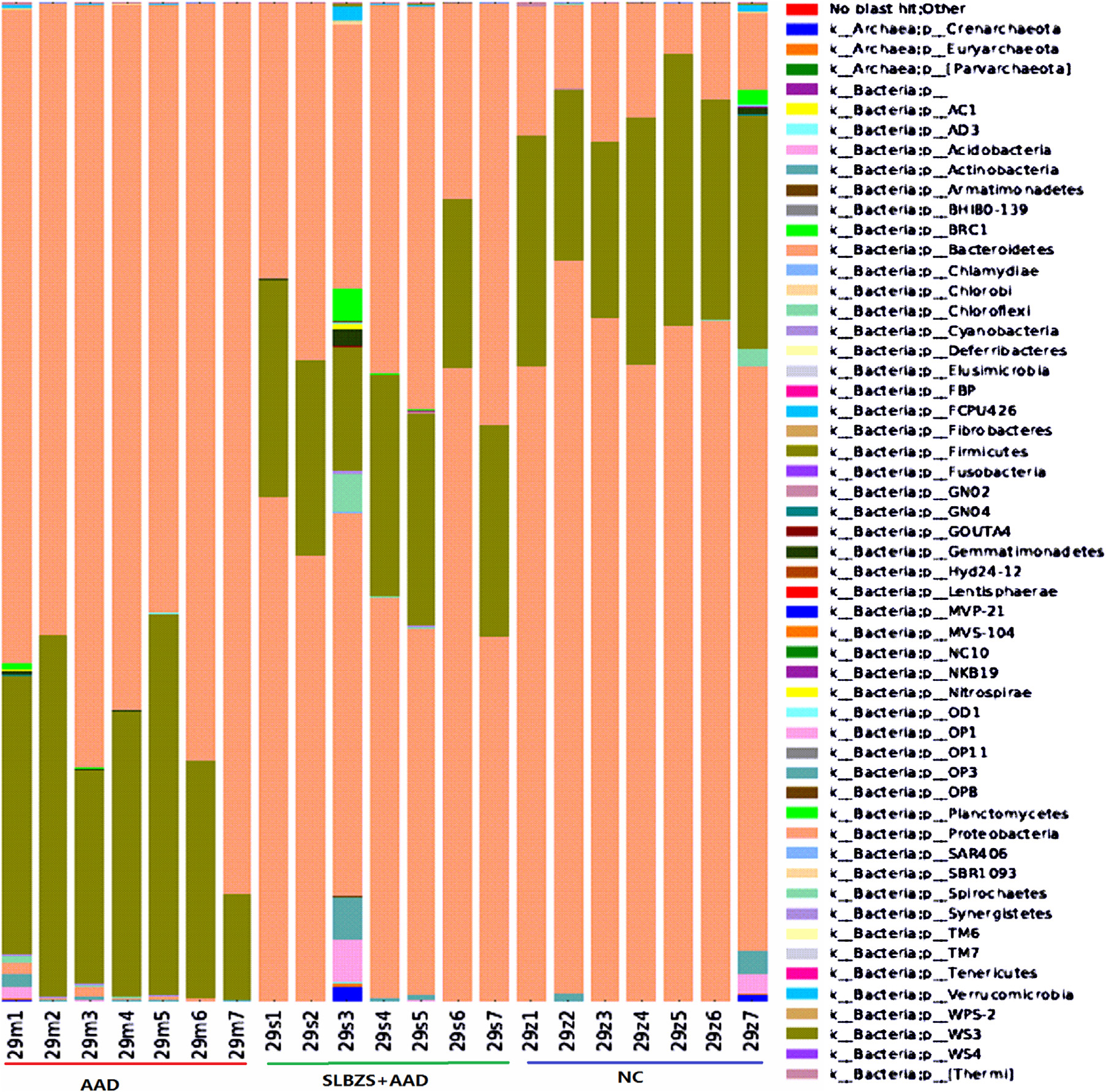 Bacteroidetes大量的存在于NC组(66.23%)和AAD+SLBZS组(44.33%),但是在AAD组中其相对丰度很低(0.46%),与其他两组具有显著差异,而在属水平,三组之间的肠道菌群结构也有显著差异,Sutterella属和Bacteroides属可能与AAD的发生发展关系密切。