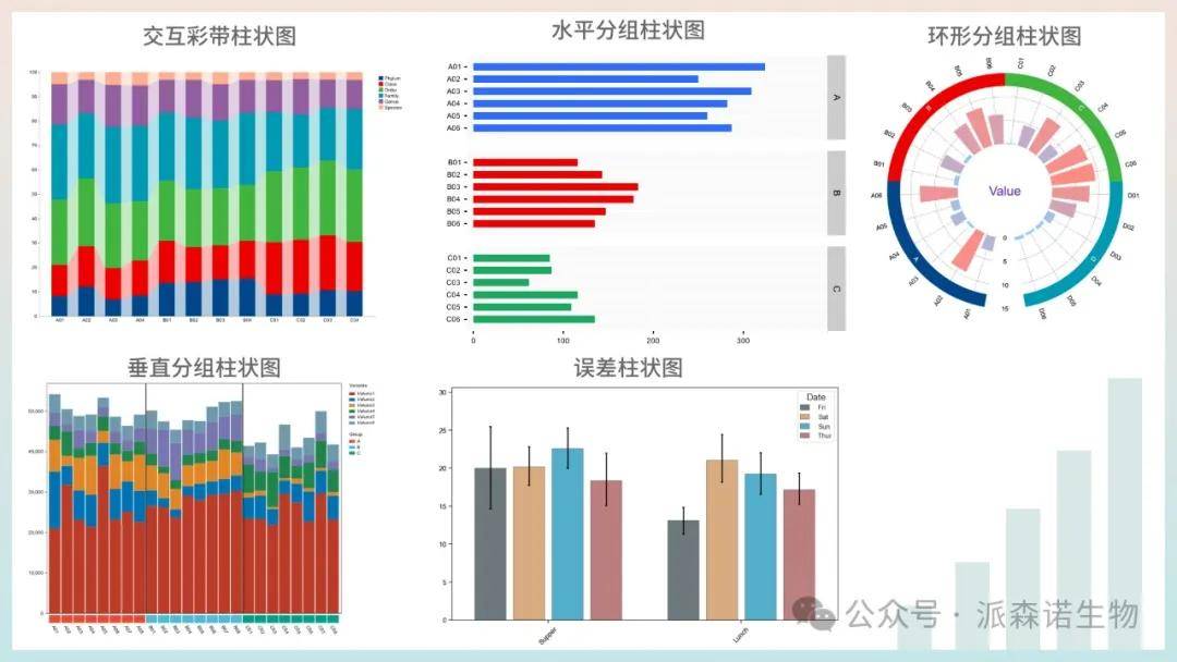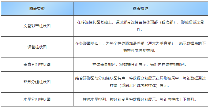 柱状图:突破传统条形表达,延伸出误差分析、分组对比等进阶形态。