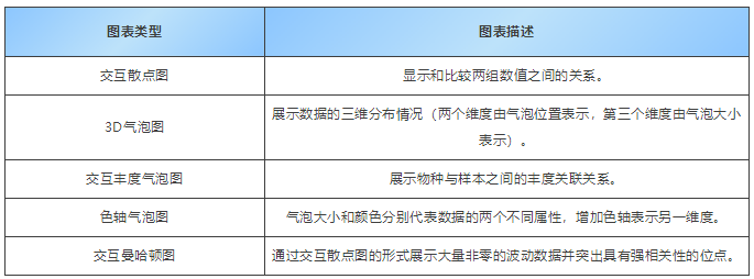 散点图:专注于多维关联分析,3D气泡图、色轴气泡图通过尺寸与色彩的双重映射实现四维数据表达,以及交互曼哈顿图等。
