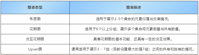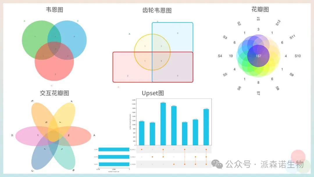 韦恩图:韦恩图家族包含韦恩图、花瓣图、Upset图,它们可根据数据集合的复杂程度灵活选用。