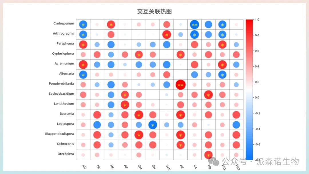 2. 相关性标注:热图格子内数值为环境因子相关性值,星号表示显著性大小。