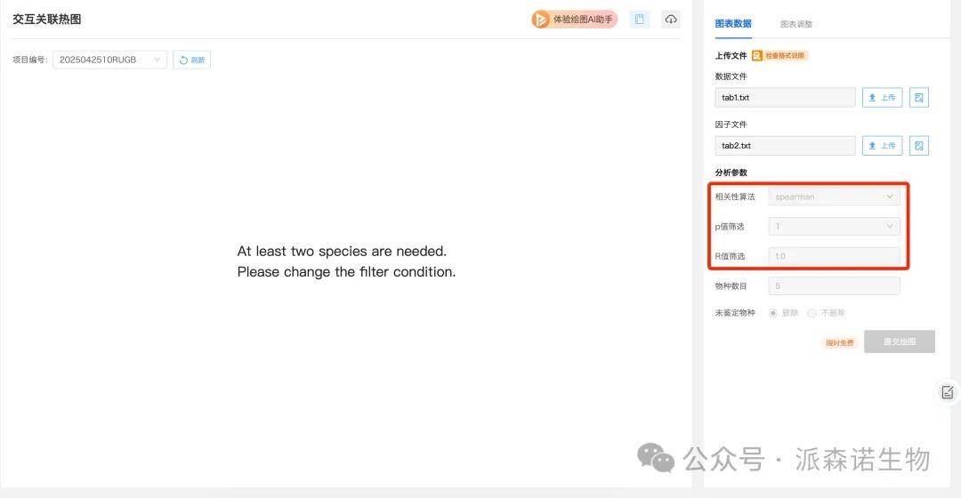 当绘图出现图下图所示的情况,首先可以更换相关性算法、相关性系数p值筛选选大一点的数值,R值调整小一些,放宽条件后如果还是不行,那就说明数据本身在设定参数条件下,没有显著关联的数据记录。