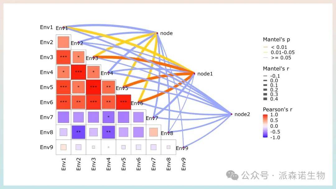 b.颜色:连线颜色体现显著性,红色代表P值<0.01,即节点与环境因子相关性统计显著。