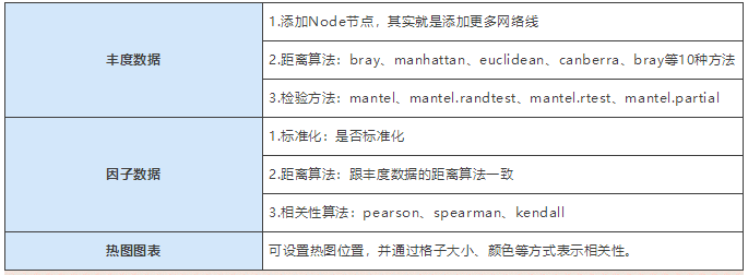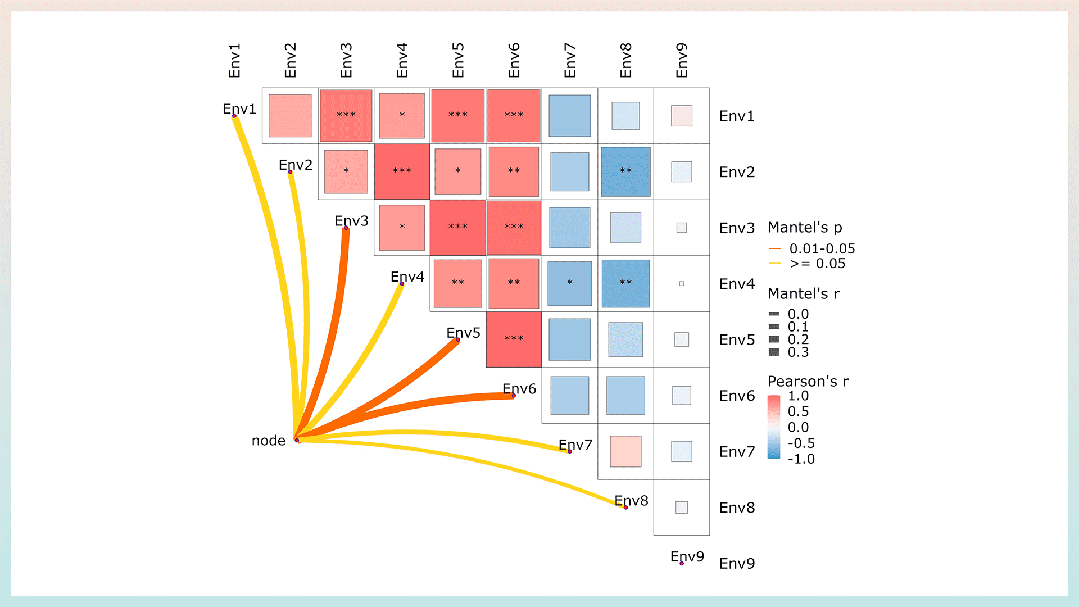 图形由热图和网络图组成,热图展示组学内的相关性,网络图展示组学间的关联性。以微生物矩阵与环境因子矩阵关联关系为例: