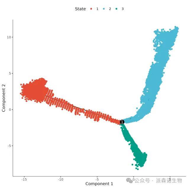 orderCells函数用于构建细胞轨迹的线性或分支结构、生成伪时间等,默认根是State 1(“State”是Monocle用来表示轨迹树分支的术语),可以使用root_state 指定根节点。