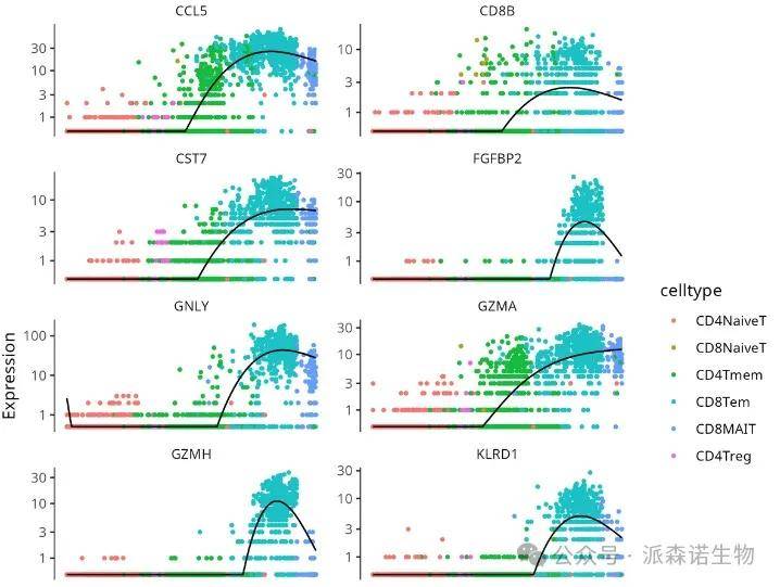 plot_genes_in_pseudotime函数用于分支分析中基因表达的可视化,展示基因在分支点的表达差异