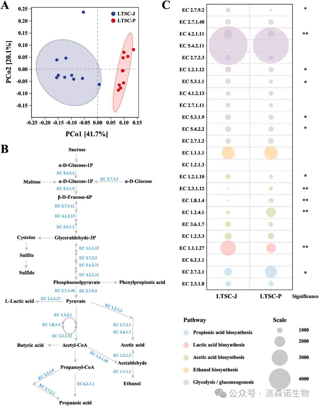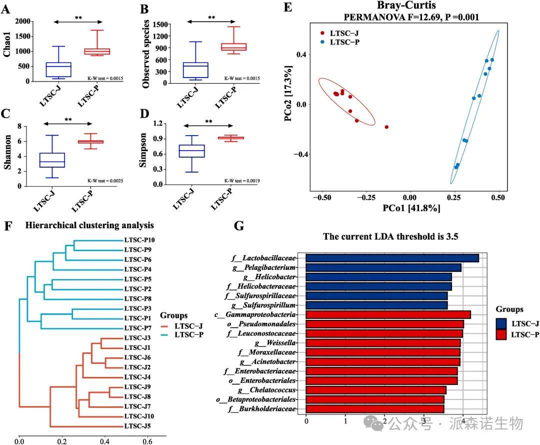 图2 LTSC-J和LTSC-P样本的细菌多样性、群落结构和生物标志物