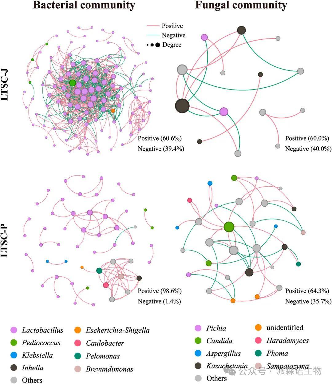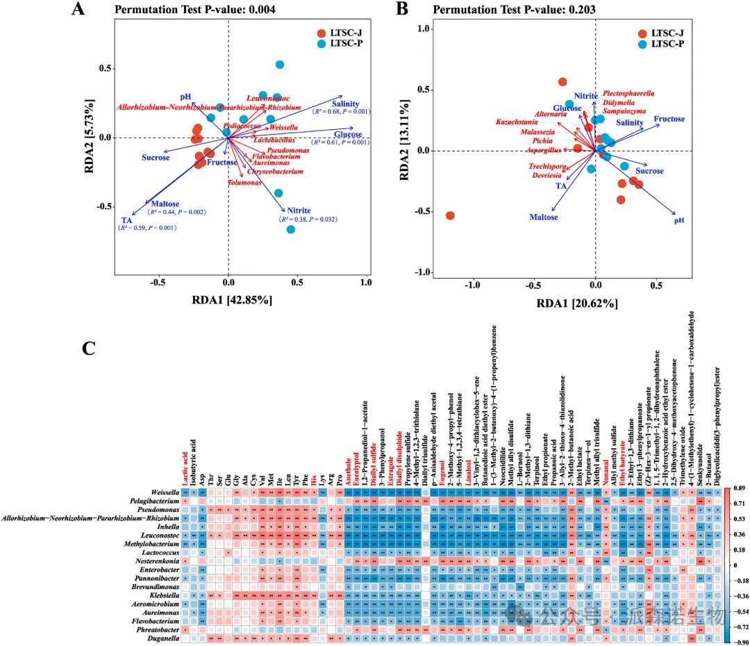 本研究对两种类型的老坛酸菜的理化性质、糖类、有机酸、氨基酸、挥发性风味图谱和微生物群落进行了研究。与LTSC-P相比,较高的乳酸含量和挥发性风味化合物浓度是LTSC-J的独特风味。两种类型的老坛酸菜在微生物组成、α多样性和群落结构上的差异可能是由于其盐度和发酵环境的差异所致。此外,差异风味化合物的生物合成可能与老坛酸菜的某些细菌属有关。综上所述,不同生产工艺对老坛酸菜的菌群和风味有显著影响。本研究揭示了罐池腌制的微生物组成和风味特征,提高了我们对两种类型的核心功能细菌属和真菌属的认识。但这些风味化合物的形成机制及其与老坛酸菜地区微生物群落的关系仍有待进一步研究。