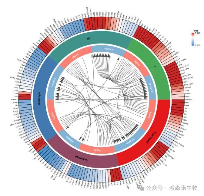 图中展示了不同细胞类型间的受配体相互作用方向,受配体基因对以及其通讯概率。在绘图时,我们使用cellchat分析流程输出的通讯总表cellchat.Communication.net.xls作为输入文件,核心绘制代码示例如下: