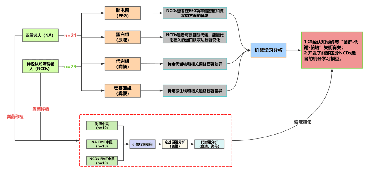 本研究通过系统整合宏基因组、蛋白组、代谢组和脑电图数据,并结合小鼠移植实验证实因果关系,全面揭示了神经认知障碍(NCDs)患者在“肠道微生态—代谢—脑功能”维度上的多组学特征。尤其是多组学与EEG融合构建的机器学习模型,在NCDs早期筛查与个体化诊断中展现出显著优势。研究不仅为NCDs的发病机制提供了新的解释框架,也为未来精准医学中的多组学诊断方案奠定了基础。多组学融合,正成为认知障碍研究与转化医学的关键突破口。