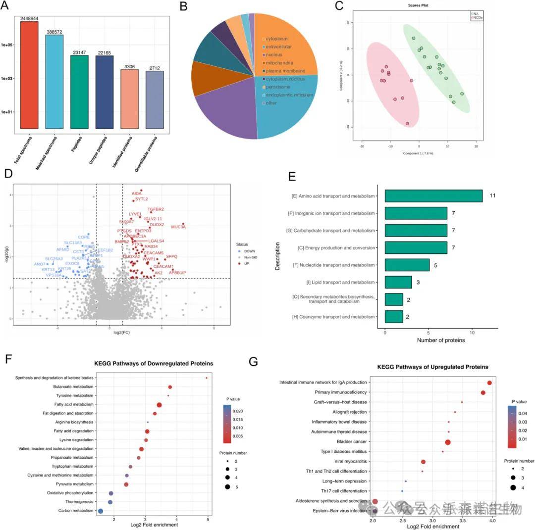 随后使用尿液样本开展了label-free定量蛋白组学分析,鉴定出2712种蛋白质。结果显示,NCDs组在能量代谢、氨基酸转运等通路中的关键蛋白显著表达异常。KEGG分析指出,色氨酸代谢、酪氨酸代谢等神经相关代谢路径下调,而多个疾病相关信号通路(如炎症性肠病、抑郁症、糖尿病)上调,可能反映系统性病理特征的协同发展。这些差异蛋白不仅验证了宏基因组学预测通路的正确性,也为寻找早期非侵入式诊断标志物提供了新线索。