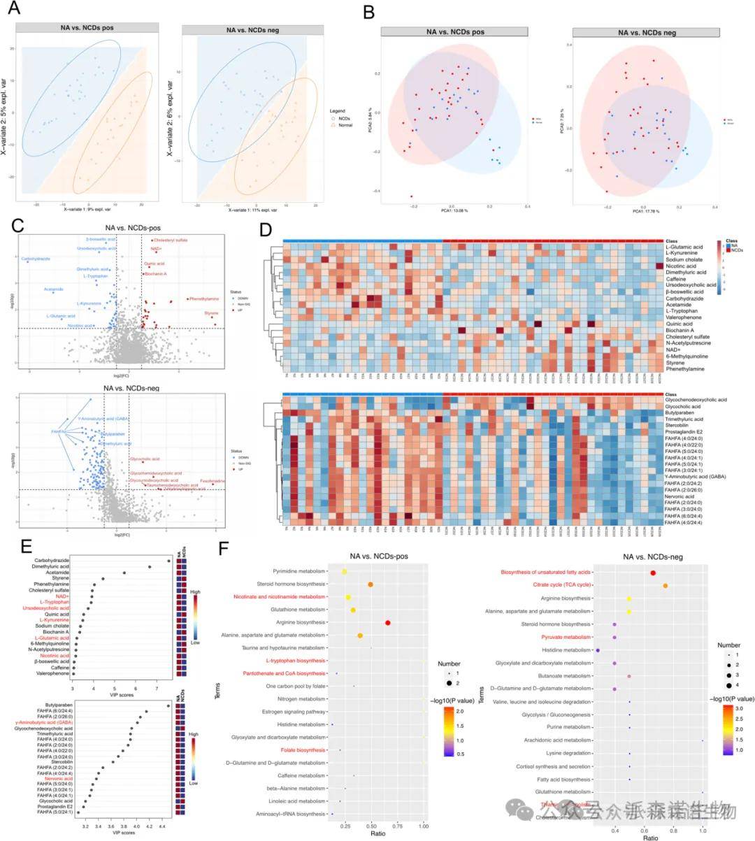 对粪便样本进行非靶向代谢组分析,发现NCDs患者与正常老龄人之间的代谢物组成存在显著差异。NAD⁺、L-色氨酸、GABA、谷氨酸等与神经传导、能量代谢密切相关的分子均在NCDs组中显著下调。此外,脂肪酸酯(FAHFAs)等抗炎代谢物也显著减少。KEGG通路富集结果进一步揭示,烟酰胺代谢、TCA循环、辅酶A合成等重要生理过程发生系统性紊乱。代谢组数据与蛋白组和宏基因组高度吻合,强化了“肠道-代谢-认知”这一潜在致病轴。