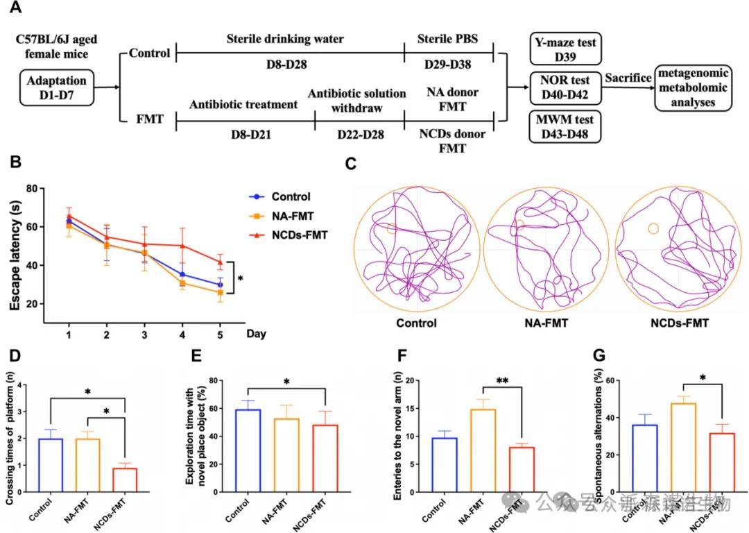 研究团队将NCDs与正常老龄者的粪菌分别移植至抗生素处理后的老龄小鼠。行为学测试(Morris水迷宫、Y迷宫、新物识别)显示,NCDs-FMT小鼠认知功能明显下降,提示肠道菌群改变可直接诱导学习与记忆障碍。随后的宏基因组与代谢组分析进一步验证了人群中发现的特征菌(如 R. gnavus)与代谢异常(如TCA循环紊乱)在小鼠模型中的再现性。这为NCDs的“肠脑轴”机制提供了实验依据,也为干预策略(如益生菌治疗)提供了理论基础。