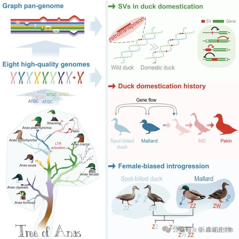 目前,鸭子的物种多样性以及驯化情况还不太清楚。为此,研究团队构建了 8 个染色体水平的 Anas(鸭属)基因组,加上北京鸭的基因组,共同来研究鸭属的进化和驯化过程。结果发现,相比较常染色体,Z染色体受渗入影响小些,且其局部系统发育比较稳定。从 Z 染色体角度来看,鸭属中的绿头鸭(Anas platyrhynchos)和灰鸭(Anas zonorhyncha)物种形成时伴随着持续的雌性偏向基因流动,鸭子的驯化历史也发生了改变。基于此,通过构建鸭属的泛基因组,确定了家鸭和野鸭之间好几种差异化的结构变异(SVs),这些 SVs 可能会调节它相邻的基因,比如 GHR 基因和 FER 基因,这两类基因是有潜力成为 “驯化基因” 的。还发现长末端重复(LTR)反转录转座子爆发活动加速了鸭子的驯化,特别是促使 MITF 基因和 IGF2BP1 基因的功能发生了显著转变。这些发现生动形象地为理解动物进化过程提供了参考案例。