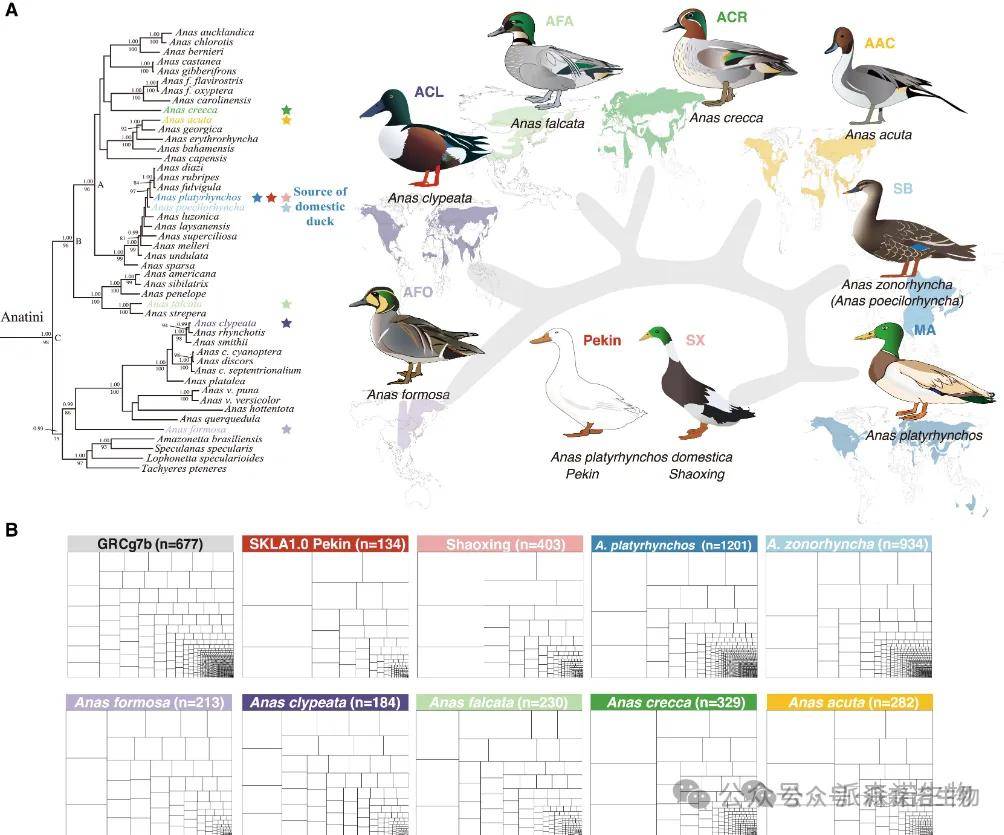 鸭子是 Anas 和其他 Anatidae 物种的统称,广泛分布且表现出多种表型,大多数物种具有迁徙性和性二态性。家鸭品种繁多,且野鸭具有广泛的跨物种杂交能力,这为跨物种育种提供了广阔潜力。鸭子是研究动物系统发育、进化和驯化的理想模型,但其进化历史和驯化仍不清楚,尤其是只有绿头鸭被驯化的原因。本研究组装了1只家鸭和7种野鸭的高质量基因组,并结合北京鸭基因组进行全面进化分析,构建基于SV的泛基因组,探索鸭子间差异SVs对功能基因的影响,并研究转座子元件在鸭驯化中的作用。