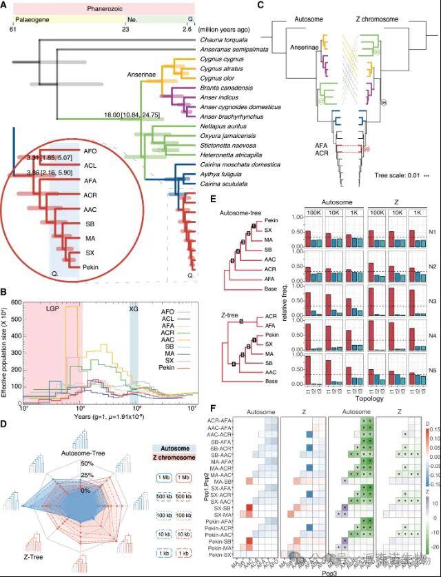 为了解 Anatidae的系统发育,研究人员利用9个Anas物种和16个非Anas Anatidae物种的4倍简并位点构建系统发育树,并用MCMTREE估计发散时间。结果显示,Anas物种约在1800万年前与Anserinae分化,约386万年前进一步分化,ACL和AFO约331万年前分化,与PSMC分析结果一致。Anas物种经历了两次种群下降,与冰期相吻合。进一步用Z染色体的4d位点构建系统发育树,发现与常染色体树存在不一致。为评估ILS影响,研究人员生成局部系统发育树,发现常染色体和 Z染色体4d位点树的支持率随窗口大小减小而降低,且局部系统发育的不稳定性主要在 “野鸭复合体” 中观察到。聚合树与4d位点树保持一致,进一步加强了常染色体和 Z 染色体系统发育之间的不一致。研究人员还对154个组合进行 D 统计量分析,检测到显著的基因流信号,表明杂交和 ILS 导致 Anas 中存在广泛的系统发育不一致,使其成为系统发育研究的宝贵模型。