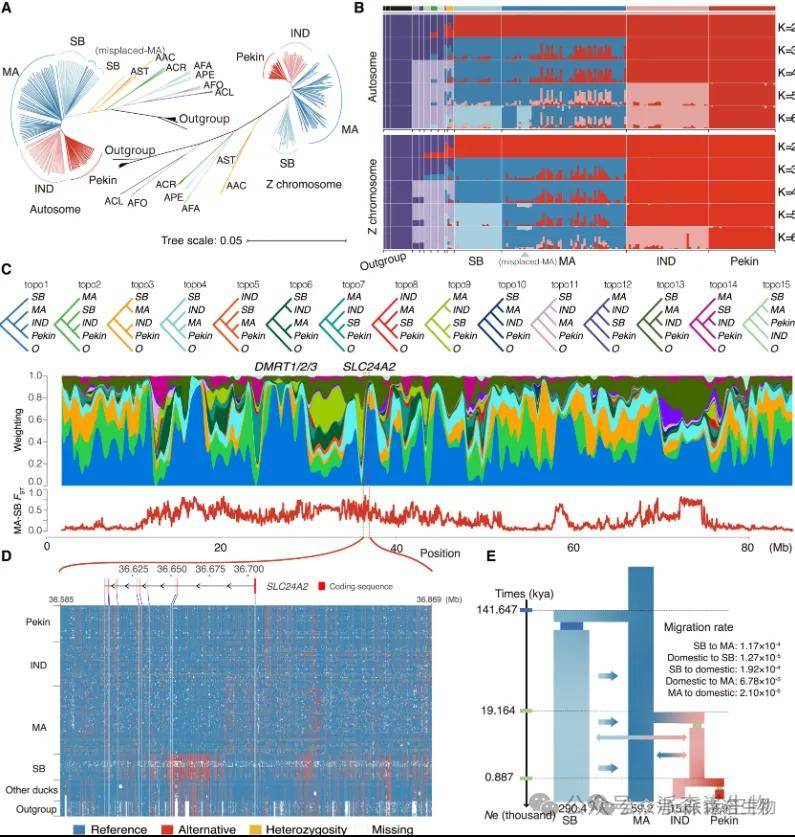 Z染色体表现出较低的基因流或不完全谱系分选(ILS)影响,其系统发育树显示绿头鸭(MA)与其他物种的分化更为明确,而常染色体树中部分MA与其他MA分化并与斑嘴鸭(SB)聚集。在ADMIX分析中,Z染色体分析显示MA与SB明显区分,而常染色体分析中部分MA与SB无法区分,表明从SB到MA存在不对称基因渗入。通过拓扑加权分析,发现Z染色体上存在抗渗入区域,包括关键的DMRT位点和SLC24A2基因。这些分析结果表明,MA与SB之间的分化和驯化过程涉及复杂的基因流动和选择事件。基于这些分析,构建了一个鸭子驯化历史模型,包括4d位点树、从SB到MA的连续不对称渗入以及初始驯化阶段的基因流动,估计SB与MA分离约142千年前,家鸭祖先从MA分化约19千年前,北京鸭从IND分离约887年前。