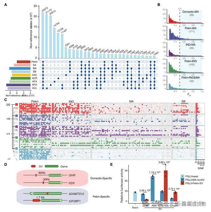 为了构建参考基因组并研究结构变异(SVs)在鸭子驯化和物种形成中的作用,研究人员利用北京鸭基因组(SKLA1.0)和新组装的8个Anas基因组生成了Anas泛基因组。进一步对22个鸭种/品种的200个个体的NGS读数进行比对,鉴定出234,931个SVs,其中22,072个SVs被所有Anas物种共享,而一些SVs在特定物种或家鸭中特异存在。通过比较家鸭与野鸭之间的不同SVs,发现与生长激素受体(GHR)、视网膜发育相关基因(FER)和羽毛颜色相关基因(如MITF和ADAMST12)的表达有显著差异,这些SVs可能通过影响基因表达促进了鸭子的驯化。
