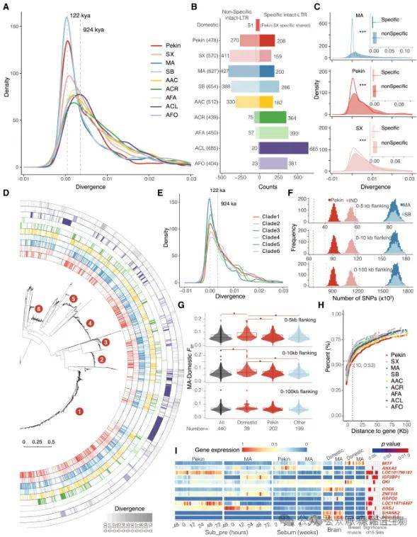 在Anas属的进化过程中,LTR反转录转座子(RTs)是结构变异(SVs)的重要来源,对基因表达产生影响。研究发现,Anas属经历了两次LTR RT突发:一次近期爆发约122千年前,涉及家鸭及其近缘物种(如北京鸭、绍兴鸭、绿头鸭和斑嘴鸭);另一次古代爆发约924千年前,涉及其他五个远亲物种。每个Anas基因组包含独特的完整LTR RTs(完整LTR),数量从159到665不等,其中北京鸭与绍兴鸭共享51个完整的LTR,表明近期的LTR RT爆发在鸭驯化过程中持续发生。完整LTR的分歧时间较短,表明其最近产生。LTR序列的系统发育树显示出六个分支包含大量扩增的LTR RTs,内分支长度较短,与LTR RT最近出现的突发峰值一致。LTR爆发对基因功能的影响显著,超过53.1%的完整LTR位于基因或其侧翼区域,影响了153个基因,其中67.4%的基因在家鸭和野鸭之间表现出差异表达。功能分析显示,这些LTR RTs通过产生SVs和调节基因表达,在鸭子的进化轨迹和驯化中发挥重要作用,增强了鸭子对家庭环境的适应能力。