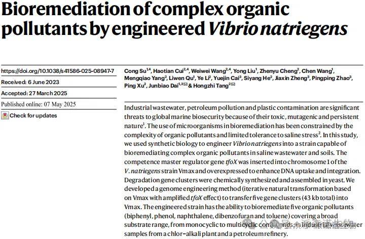 [1]Su C, Cui H, Wang W, Liu Y, Cheng Z, Wang C, Yang M, Qu L, Li Y, Cai Y, He S, Zheng J, Zhao P, Xu P, Dai J, Tang H. Bioremediation of complex organic pollutants by engineered Vibrio natriegens. Nature. 2025 May 7. doi: 10.1038/s41586-025-08947-7. Epub ahead of print. PMID: 40335686.