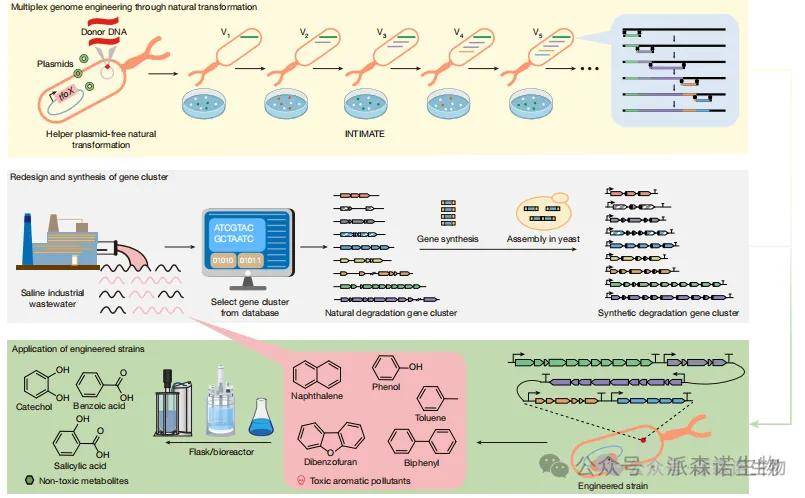 文章简介:本研究成功开发了基于需钠弧菌的复合污染物工程菌构建平台,实现了从代谢通路的挖掘、设计和合成到单一、复合污染物降解菌株的构建、测试、以及在实际工业废水样本处理应用的全流程,为石化、氯碱等高盐废水处理、海上石油泄漏、微塑料污染等全球性挑战提供了生物解决方案。同时,INTIMATE技术为多基因簇工程底盘的构建提供了通用技术平台,使得同一菌株中多种代谢功能的整合以及优质菌种的迭代功能拓展成为可能,可扩展至其他污染物降解体系的构建乃至天然产物合成、高值化学品细胞工程构建等合成生物学应用场景。