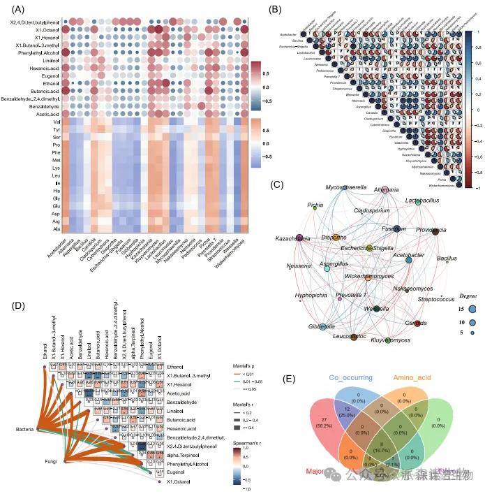 文章简介:本研究以榨辣椒为模型,设计并构建了由两种细菌和三种真菌组成的SynComs。利用高通量测序技术,研究了发酵过程中微生物的动态变化,并评估了SynComs对发酵过程的影响。SynComs将发酵时间缩短了约15天,提高了风味物质的产量(乳酸乙酯和乙酸乙酯分别提高了8%),并显著提升了榨辣椒的质量。同时,SynComs改变了真菌群落的演替模式,使得毕赤酵母在整个发酵过程中成为优势菌种,真菌群落演替模式也更接近于零模型。宏基因组注释结果表明功能基因,尤其是糖苷水解酶家族发生了显著变化。合成菌群增强了土著微生物与风味化合物之间的正相关性,同时增加了其他群落微生物对风味产生的贡献。这些发现为通过自然发酵提高榨辣椒和其他传统发酵食品的质量提供了新途径。