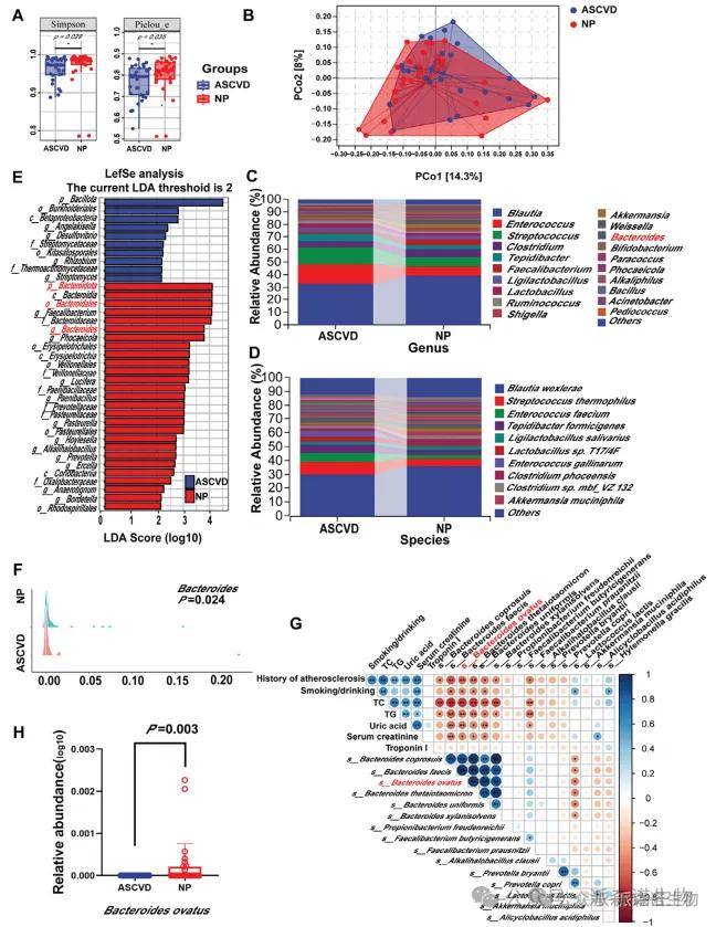 文章简介:在本研究中,通过使用动脉粥样硬化性心血管疾病患者以及有冠心病风险因素的志愿者的粪便和血清样本进行了全面的微生物组和代谢物分析,并结合培养组织学,确定了核心菌株拟杆菌属卵形拟杆菌(B. ovatus)。粪便微生物群移植实验进一步表明,肠道微生物群显著影响动脉粥硬化(AS)的进展。值得注意的是,B. ovatus 主要通过恢复肠道屏障和增强胆汁酸代谢来缓解 AS,特别是通过产生吲哚-3-乙酸(IAA),这是一种色氨酸衍生代谢物。IAA 抑制 M1 巨噬细胞中的 TLR4/MyD88/NF-kB通路,促进 M2 巨噬细胞极化,并恢复了 M1/M2 极化平衡,最终减轻了主动脉炎症。这些发现阐明了肠道微生物群与动脉粥样硬化之间的机制相互作用,首次证明了第二代益生菌卵形拟杆菌能够改善胆汁酸代谢并减轻炎症,为未来涉及该菌株的动脉粥样硬化治疗应用提供了理论基础。
