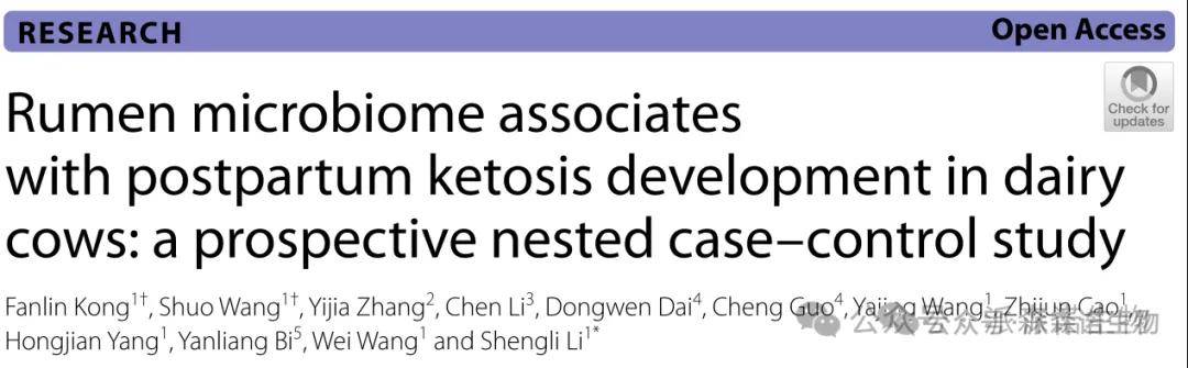 [4]Fanlin Kong, Shuo Wang, Yijia Zhang, Chen Li, Dongwen Dai, Cheng Guo, Yajing Wang, Zhijun Cao,Hongjian Yang, Yanliang Bi, Wei Wang and Shengli Li1. Rumen microbiome associates with postpartum ketosis development in dairy cows: a prospective nested case–control study. Microbiome 13.1 (2025): 69.