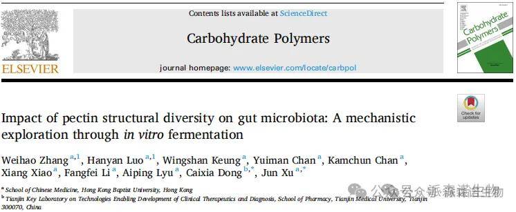 [5]Zhang W, Luo H, Keung W, Chan Y, Chan K, Xiao X, Li F, Lyu A, Dong C, Xu J. Impact of pectin structural diversity on gut microbiota: A mechanistic exploration through in vitro fermentation. Carbohydr Polym. 2025 May 1;355:123367. doi: 10.1016/j.carbpol.2025.123367. Epub 2025 Feb 10. PMID: 40037737.
