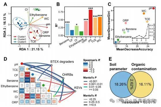 文章简介:本研究中,从一个相对较小区域(20×20 平方米)内受苯、甲苯、乙苯和二甲苯(BTEX)以及氯代脂肪族烃(CAHs)污染的多个位置采集的样本被进行比较,以检验其物理化学和微生物特性。对 16S rRNA 基因扩增子和宏基因组测序数据进行的无监督聚类分析表明,原生群落分化为三种不同的模式。在Cluster 1 中,具有多种单氧化酶和谷胱甘肽 S-转移酶(GST)的假单胞菌在受高浓度 BTEX 和 CAHs 污染的样本中富集;Cluster 2包含较高比例的共代谢降解者;Cluster 3 主要由赖斯纳氏菌和有机卤化物呼吸菌(OHRBs)组成,它们通过还原脱氯作用对 CAHs 进行降解。微生物群落之间组成和功能的显著差异归因于有机污染物的分布差异,即使是在如此小的区域内也是如此。将基因组特征与物理化学数据相结合,能够显著加深对土壤中异质性的理解,并揭示其对微生物群落的影响,从而为优化生物修复策略提供有价值的信息。