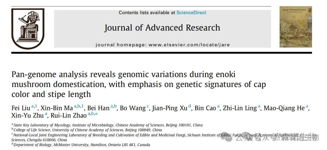 参考文献:Liu F, Ma XB, Han B, Wang B, et al. Pan-genome analysis reveals genomic variations during enoki mushroom domestication, with emphasis on genetic signatures of cap color and stipe length. J Adv Res. 2024 Nov 5:S2090-1232(24)00497-1. doi: 10.1016/j.jare.2024.11.005.
