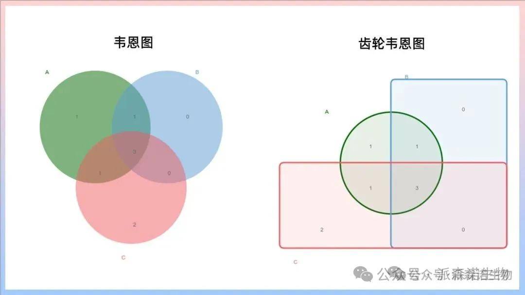 韦恩图:通过重叠圆圈展示集合间逻辑关系的可视化工具,用于直观呈现集合的交集、并集、差集等关系