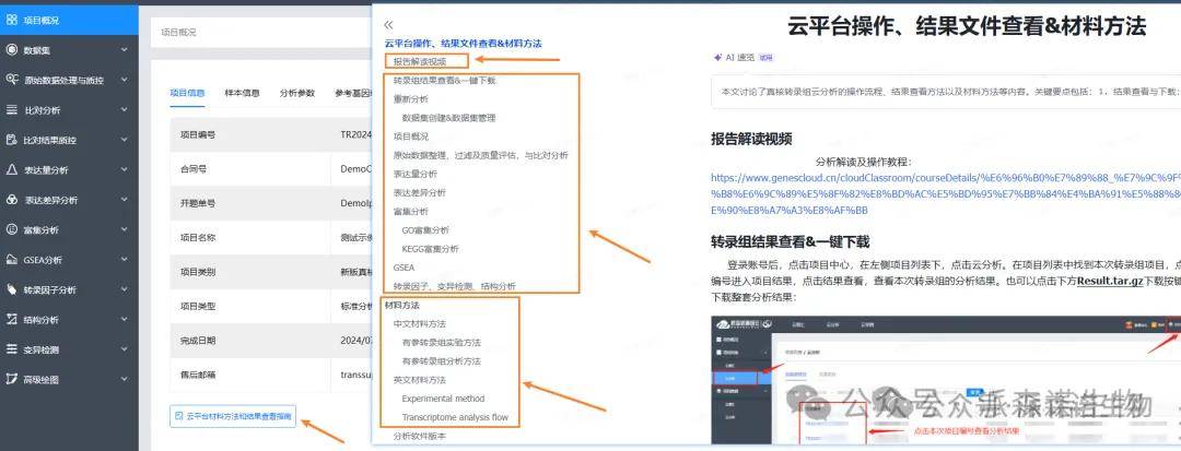 老师们做完转录组(真核有参、原核)后,对分析结果不清楚的话,可以直接在项目概况里点击云平台材料方法和结果查看指南,里面有报告解读视频、结果查看介绍、材料方法,方便老师们对分析结果的理解掌握。