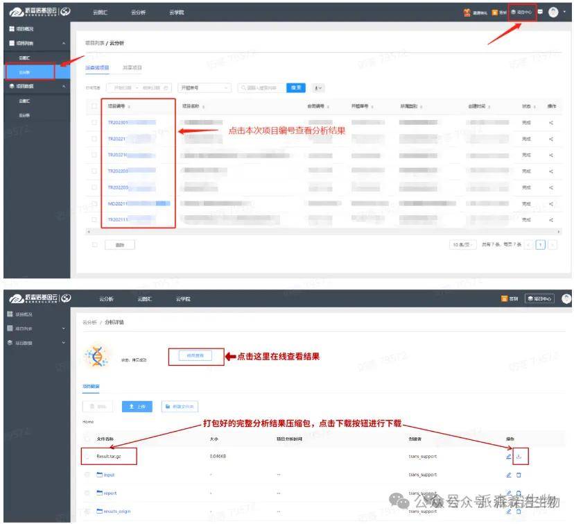 1、所有标准分析结果的下载:登录账号后,点击项目中心,在左侧项目列表下,点击云分析;在项目列表中找到本次转录组项目,点击项目编号进入项目结果,点击下方Result.tar.gz下载按键,打包下载整套分析结果。