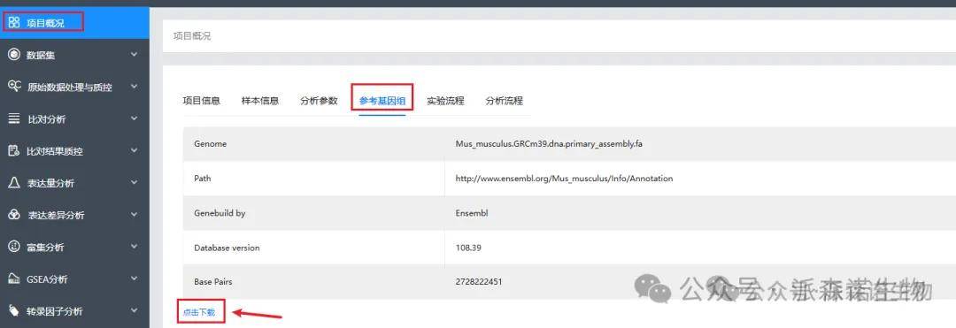 2、基因注释表下载(Annotation.xls,包括基因ID、染色体、起始终止位置、正负链、外显子长度、基因name、各个数据库的注释):项目概况→参考基因组→点击下载。