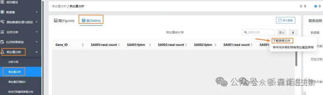 3、表达量结果下载(Expression_with_annotation.xls,包括表达量和注释):表达量分析→表达量分析→表→下载表格文件。