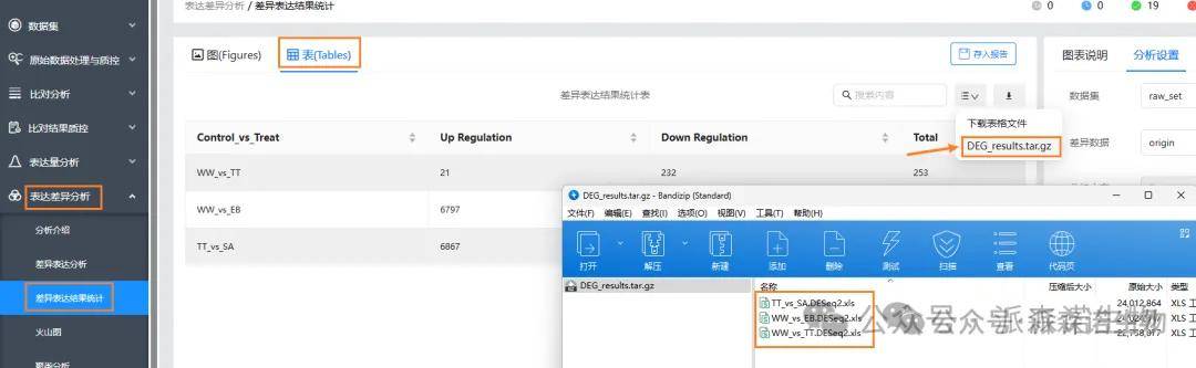 4、差异分析结果下载(上下调基因详细信息,XX_vs_XX.DEseq2.xls,包括差异和注释):表达差异分析→差异表达结果统计→表→DEG_results.tar.gz。