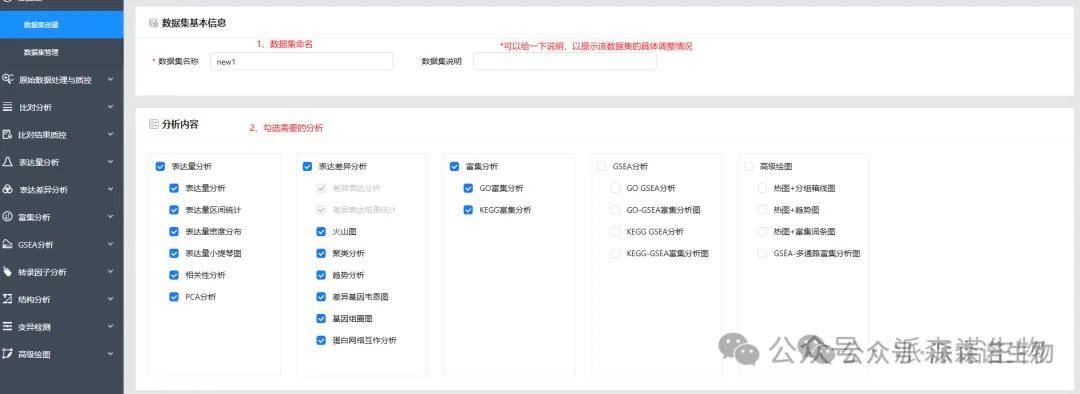 分析完成后(数据集管理里可以看是否运行完成),在各部分(2里勾选的分析)的 数据集 里选择新命名的数据集就可以展示新的分析结果了。