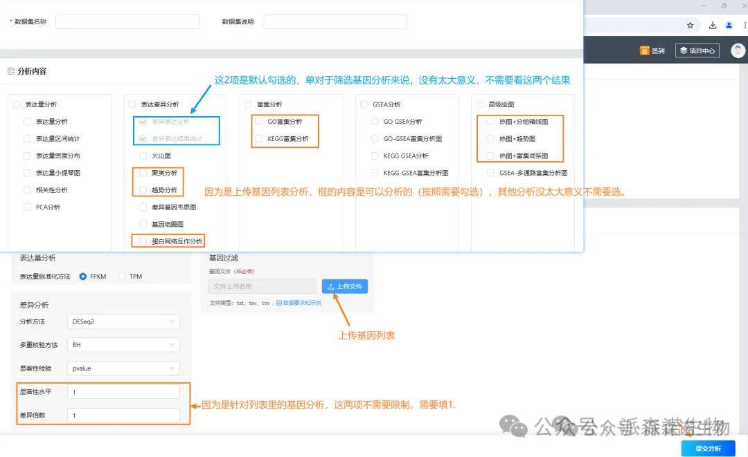 针对部分筛选出来的目标基因(可以通过venn图筛选多个比较组共有、特有差异基因;可以根据富集结果筛选关注通路上的差异基因等),老师可以通过数据集里上传基因列表的方式去分析。