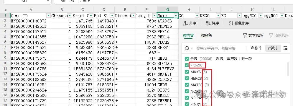 答:因为基因name并不是所有基因都有的,有些基因是没有name注释的,有些基因的name有重名的情况(以下图ensembl数据库里人的基因组注释为参考),因此分析都是用唯一且都有的基因ID进行的。我们在分析结果的注释、表达、差异表中都加上了基因ID和基因组里注释的Name的对应关系,可以直接在这3个表里查看。