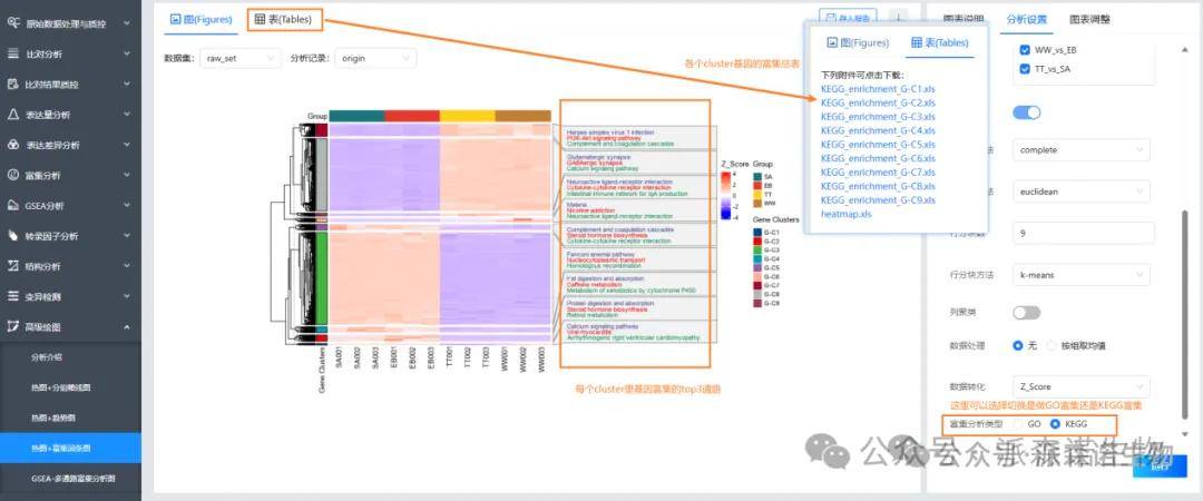 答:是基于差异基因并集在样品里的表达量情况,划分为9个cluster,每个cluster里的基因表达模式相近。也可以在分析设置里自定义需要划分的cluster数量,去重新运行。需要对cluster里的基因做功能分析的话,可以到高级分析的热图+富集词条图里去查看。