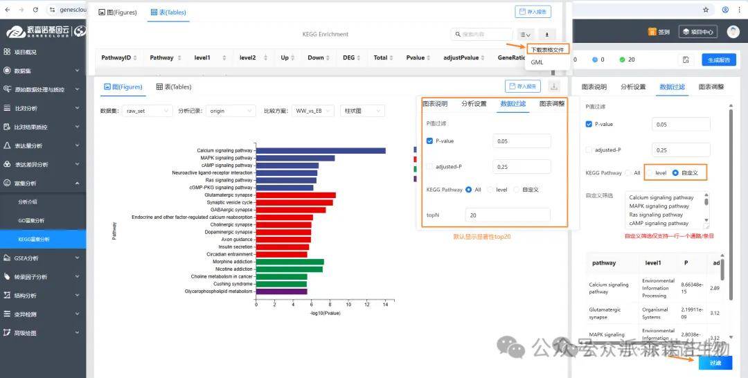 答:富集分析默认是展示显著性top20 GO term或KEGG通路的,但是本身来说可能富集到的通路会更多的,老师可以下载富集表格,在表格里筛选下关注的通路,看对应的富集情况。然后可以在数据过滤里针对关注的通路,去自定义绘图。